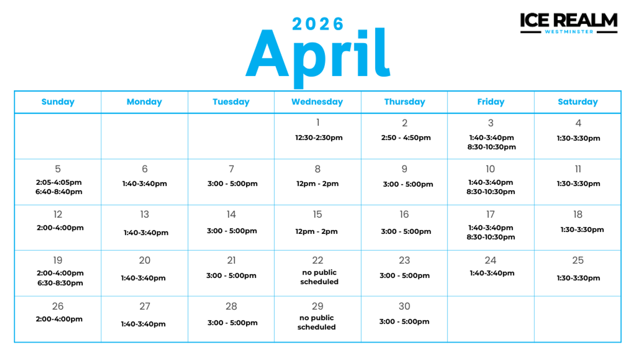More Activities at Ice Realm Westminster Broomball Opens in new window First Steps Program Opens in new window Celebrate your Birthday on ice Opens in new window